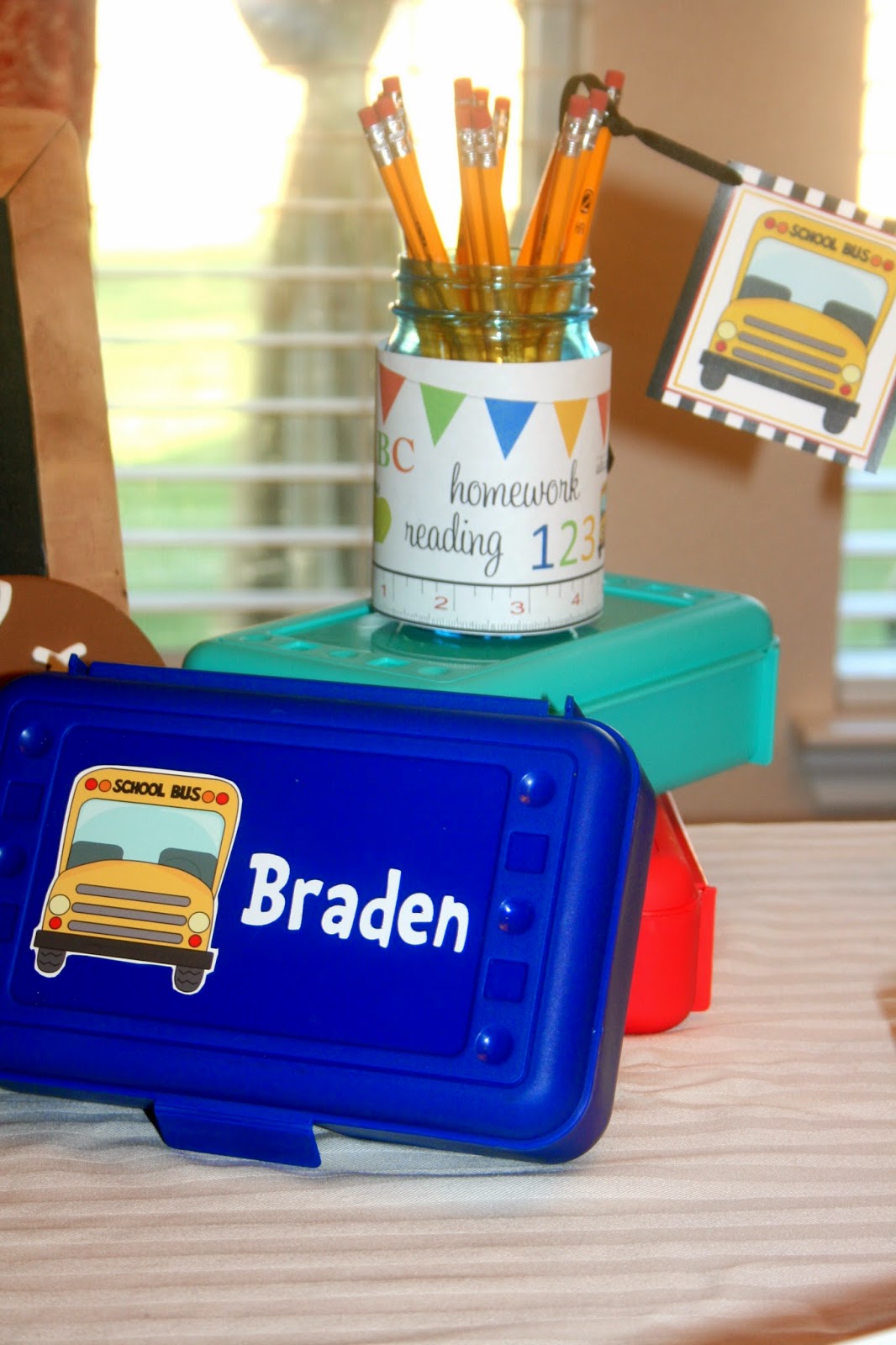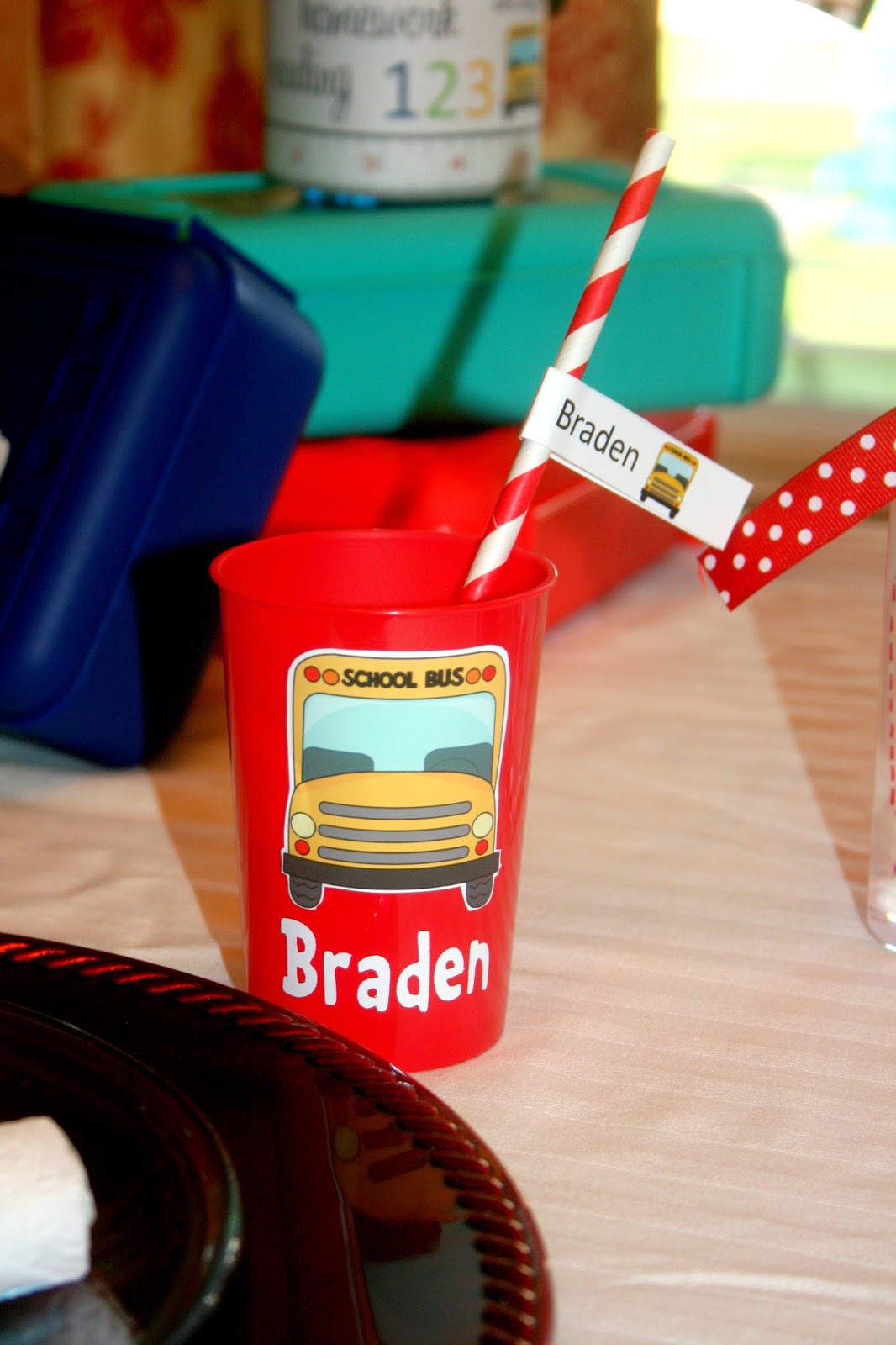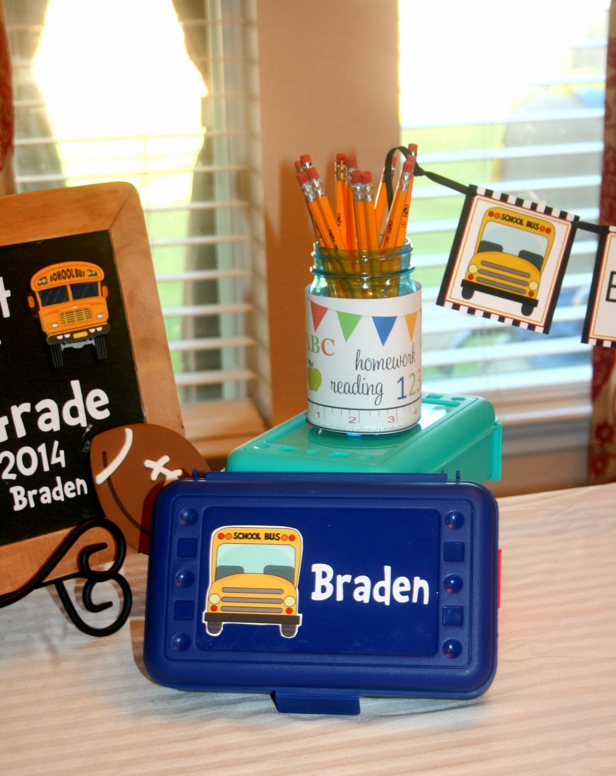 Jennifer also sent me the school bus image that I was able to print out onto a printable vinyl to create the matching cups and pencil boxes. To complete the table set up we also used this FREE PRINTABLE from BellaGreyDesigns for the mason jars that were filled with pencils. To finish the table, I added the First Day of School Chalkboards I made for the big day!