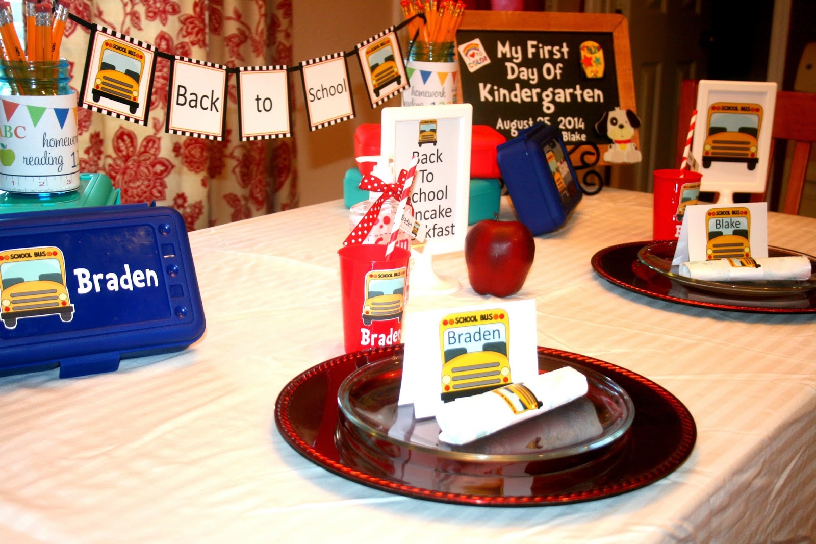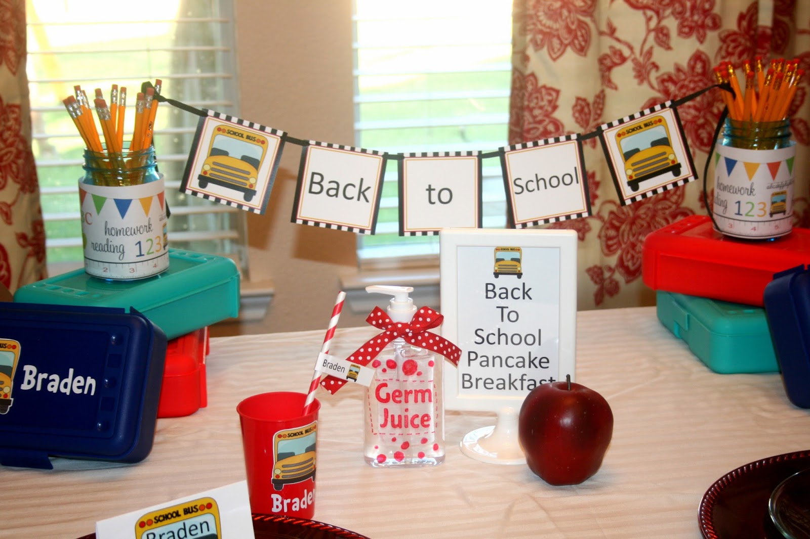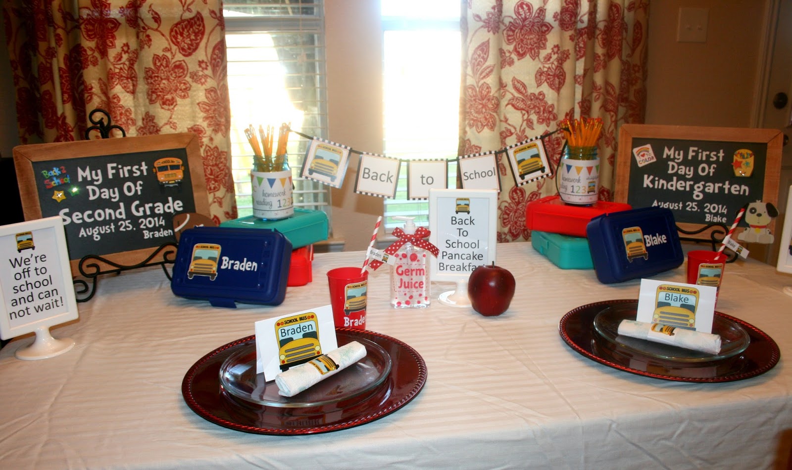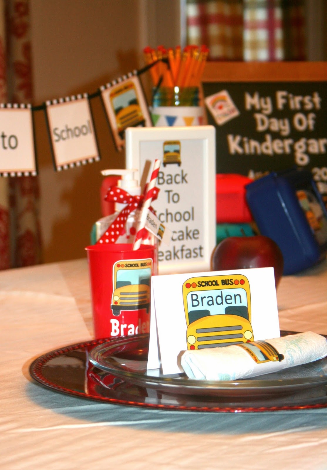 Jennifer also sent me the school bus image that I was able to print out onto a printable vinyl to create the matching cups and pencil boxes. To complete the table set up we also used this FREE PRINTABLE from BellaGreyDesigns for the mason jars that were filled with pencils. To finish the table, I added the First Day of School Chalkboards I made for the big day!