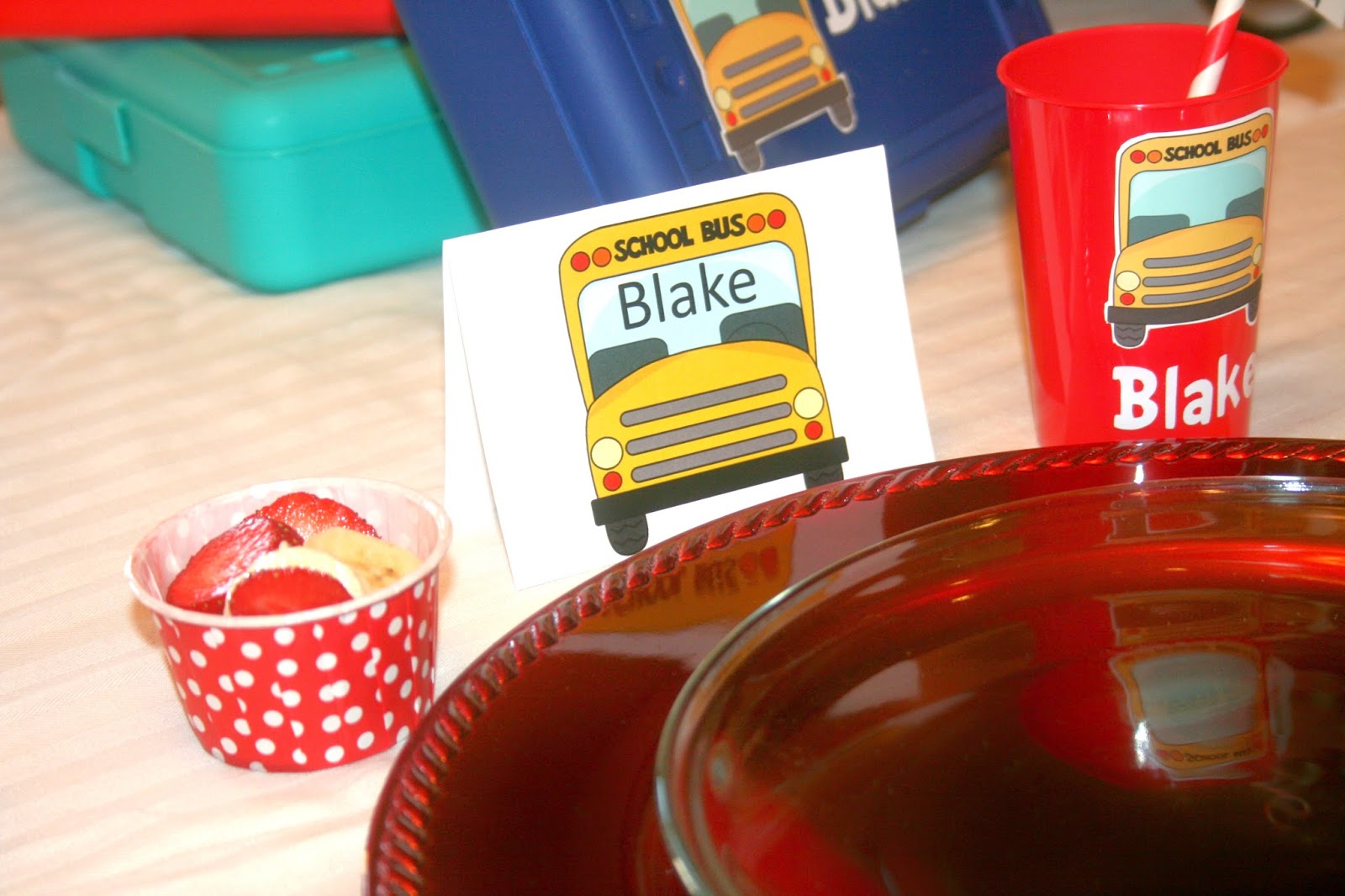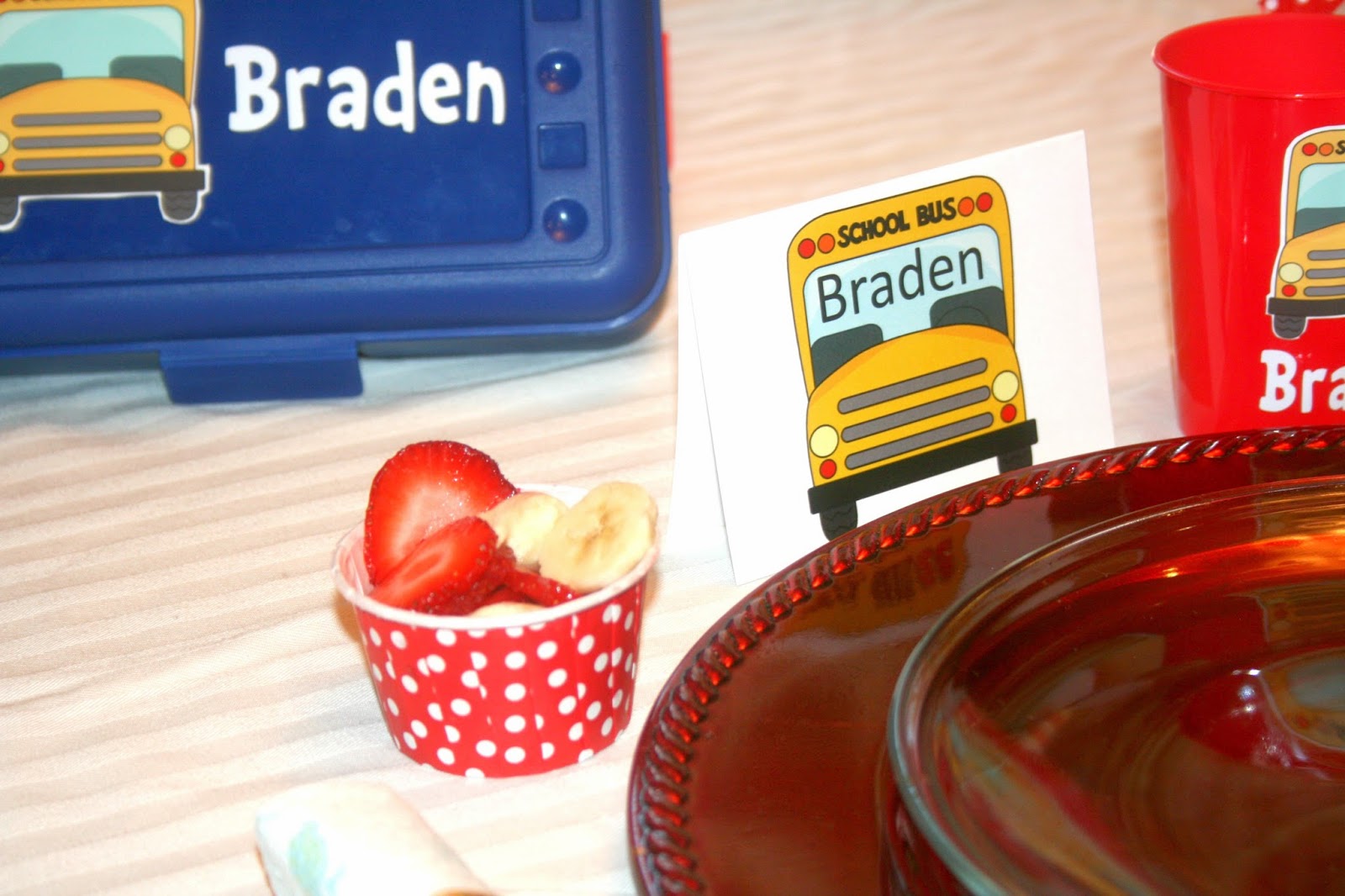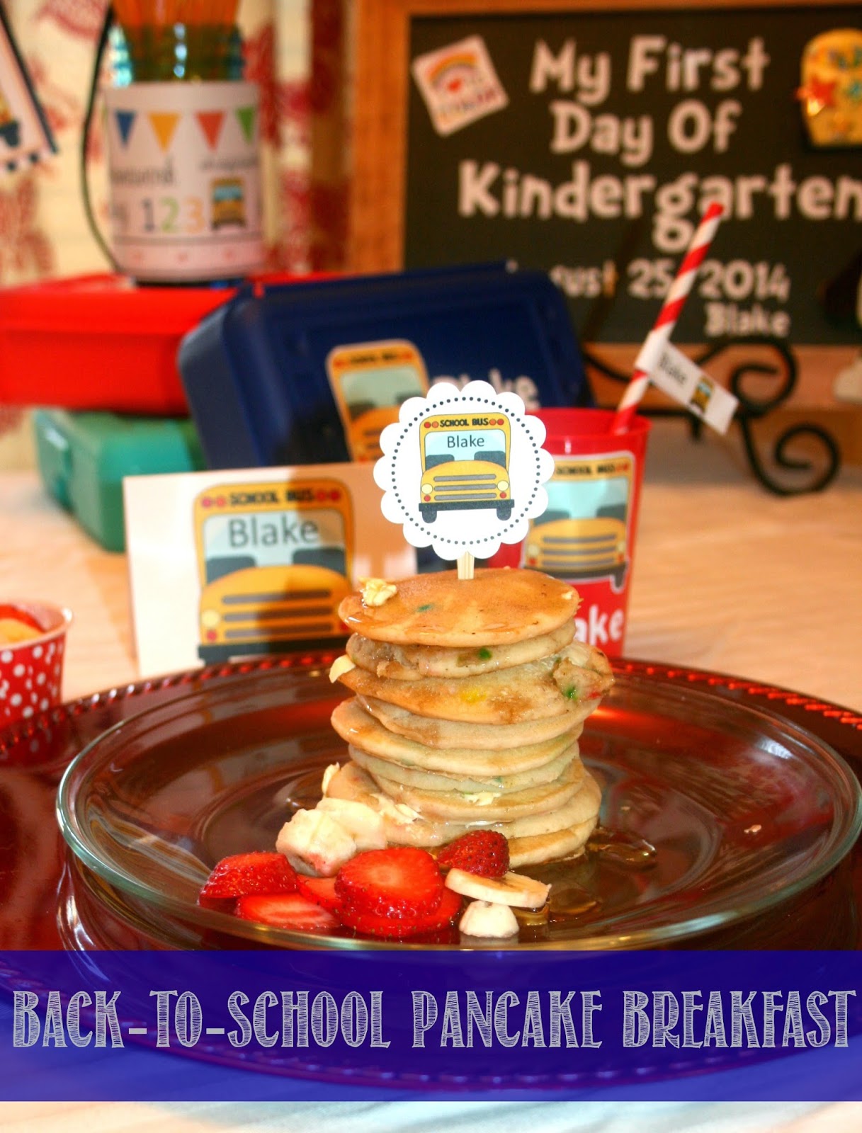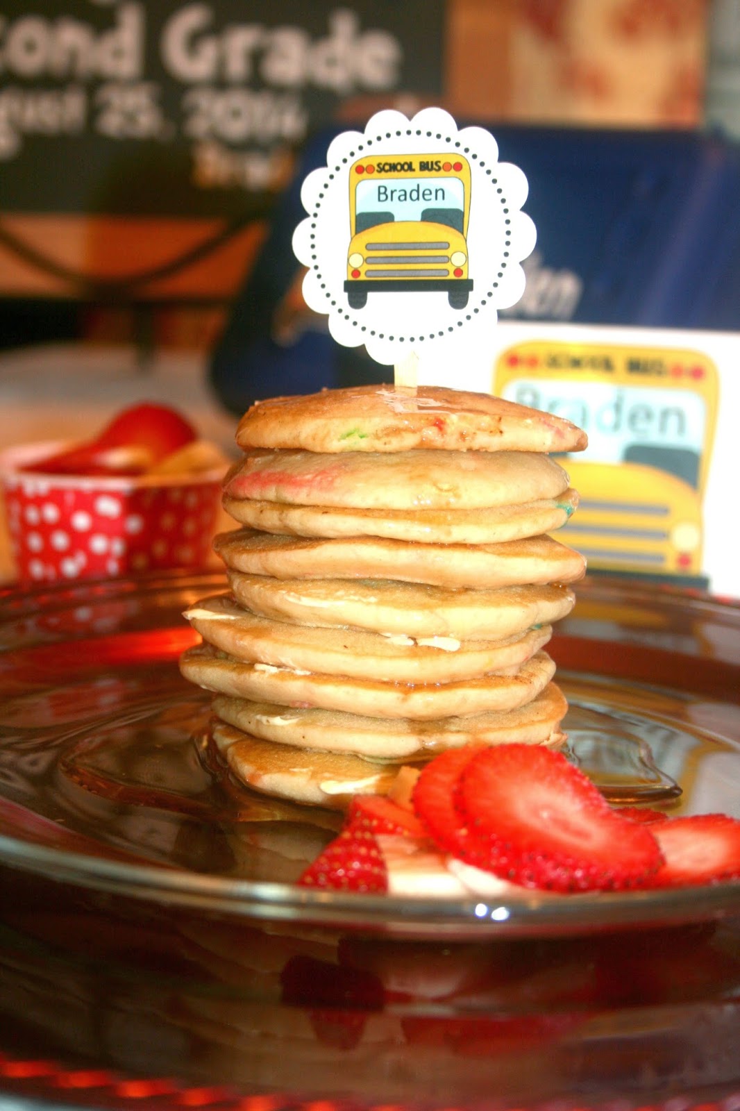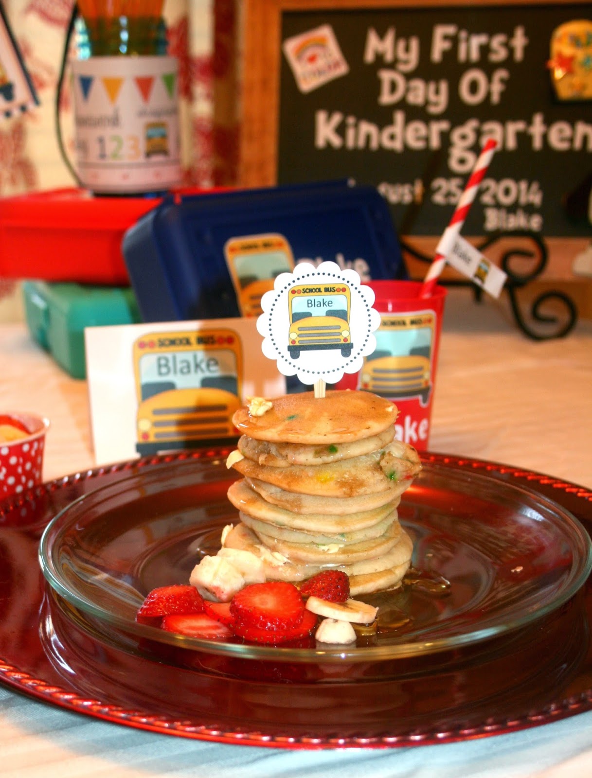 I combined their favorite breakfast foods, pancakes and fruit, with this great Back-to-School School Bus printable collection from the talented Jennifer at BellaGreyDesigns.