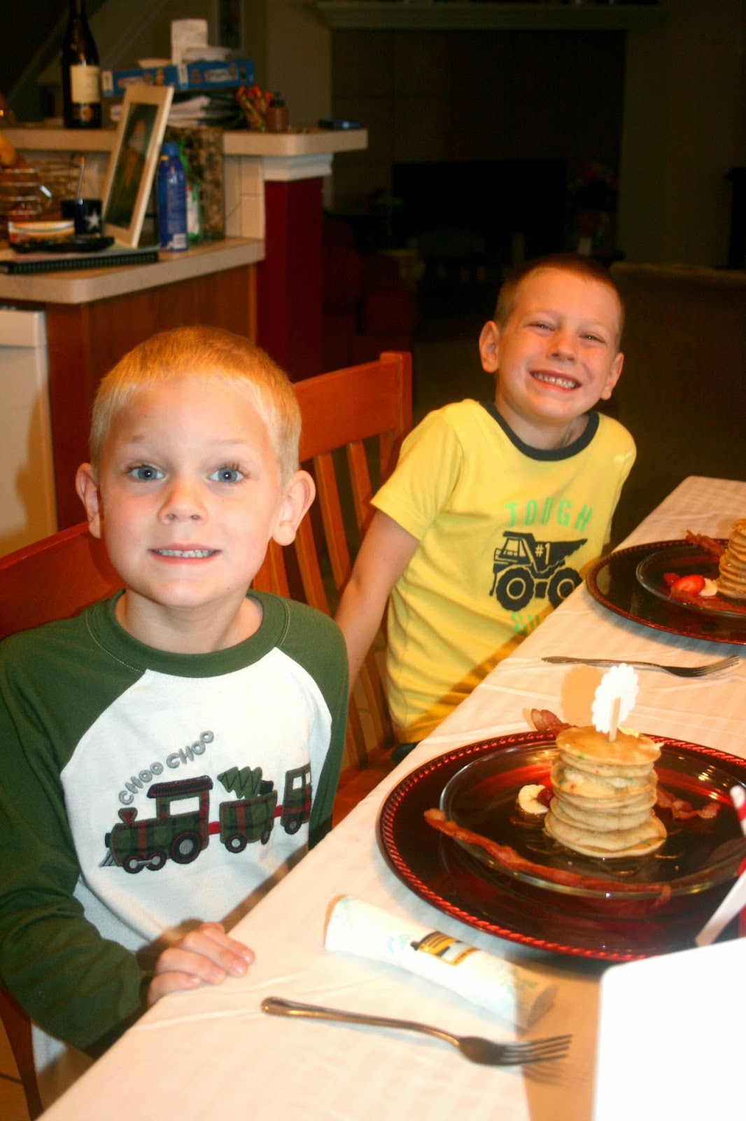 Stacks of pancakes with a side a bacon, strawberries, and bananas with of course a glass of chocolate milk were on the menu for our pancake breakfast. Not a single crumb was left on the plate afterwards. It was such a fun and memorable time for the boys. They loved it! I think this will be a new tradition each year before school starts.