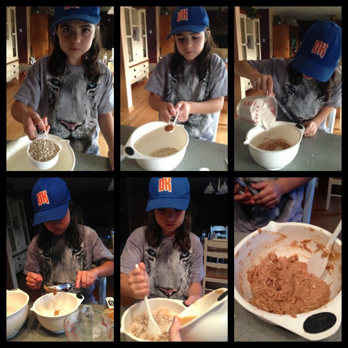 Our 5 year old golden retriever has battled allergies for the last four years and drug after drug, food after food, nothing has seemed to help ease his symptoms so I had this bright idea to completely change and alter his diet. I started with homemade dog treats. I figured, if I could do this and he likes them, making his own dog food shouldn’t be that bad. During one of our Twitter chats {every other Monday from 9-10am CST -use #t2tchat}, one of our new friend, Michelle from Our Three Peas shared her dog treat recipe. Not realizing it was going to be so easy and my daughter could help me, I wanted to make it right away…so we did!