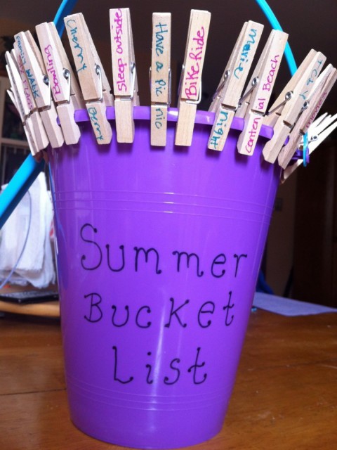 Yesterday I posted about my quest for becoming more balanced this summer and I found another way to keep the kids busy. I decided, along with the kids input, to create a Summer Bucket List. All it took was a $2.00 kids bucket and a package of $0.97 clothes pins. The kids and I sat there one afternoon and made a master list of things they would each like to do this summer. Things that we have been putting off, things we have never done, and things we just think will be a lot of fun. I even got my husband in on the list making. We wrote each activity on one of the clothes pins and just clipped it onto the lip of the bucket. When ever we are at a loss for what to do, one of the kids will close their eyes and pick a clothes pin. What ever is on it is what we do. Unless of course its something like Six Flags or Raging Waves, etc…those types of things require it to be a weekend or must be done first thing in the morning so we have more time doing what we’d love to do. So far the kids went swimming and yesterday I took them to TCBY for a nice sweet treat! The kids already picked something to do for today, we are going on a picnic in the park. I think they are enjoying their summer so far with all of the new things mom is implementing!