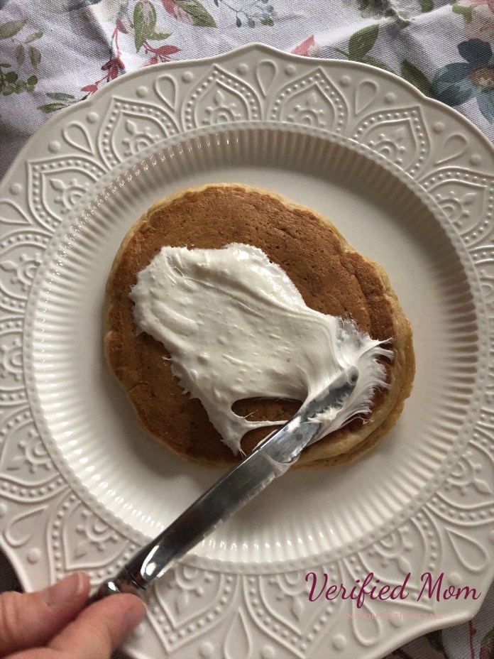 I made the Krusteaz Buttermilk Protein pancakes twice, once for the strict knowledge of what it was like in its natural state with nothing extra added to it. I just topped it with a dab of butter and a drizzling of maple syrup. The second time I made it, I made what I call my dessert pancake. I made a