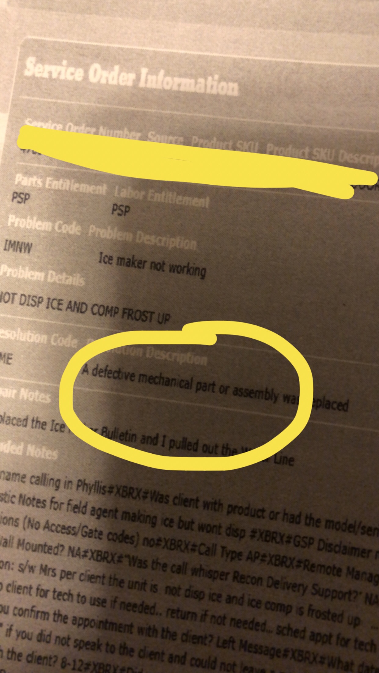 At that time, I had made them aware of the previous issues and what repairs had been attempted. Best Buy decided to order all new parts again. Ron Brown from Best Buy’s Geek Squad had come to do the repair (appointment number 47837028). He was very thorough. Asked if the previous repair guys pulled the fridge out to check the water line?